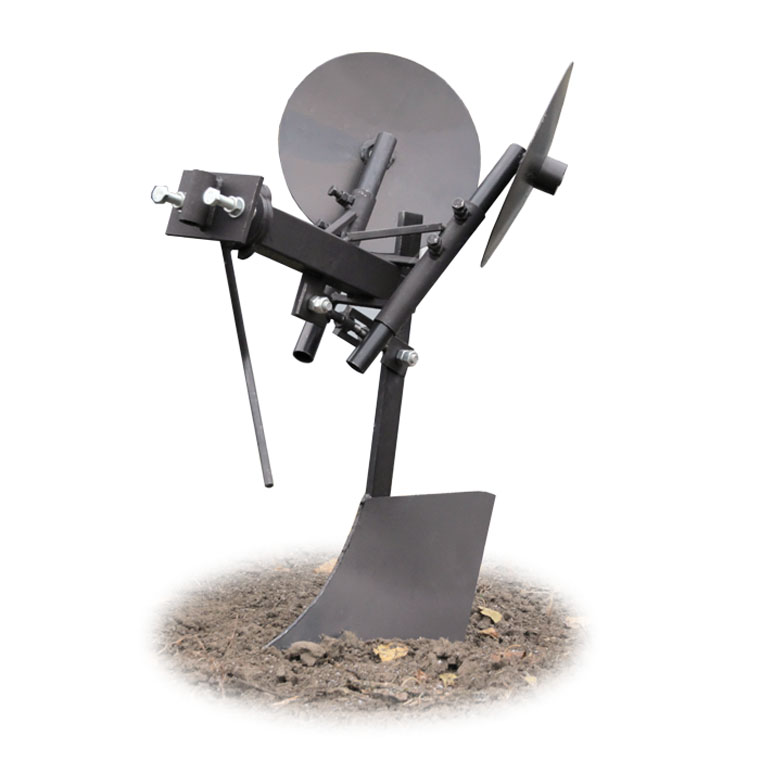 Регулювання глибини викопування залежить від діаметра коліс, які встановлені на мотоблоці. Опорні колеса картоплекопач використовуються для регулювання кута атаки. Причіпний пристрій приварене.